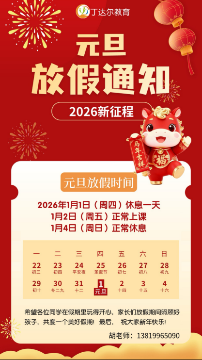 元旦佳节将至,我们全体老师向您和孩子致以最诚挚的祝福!感谢您一直以来对我们工作的信任与支持,愿新的一年里,孩子们健康成长、学业进步,家庭幸福美满,万事顺遂!